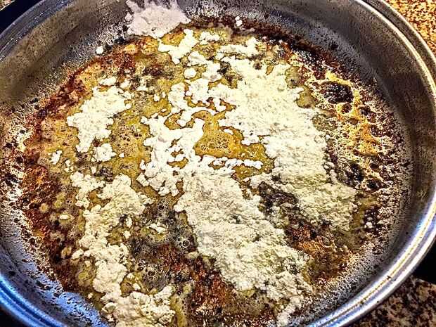 Añadir la harina a la sartén, removiendo hasta que quede suave. Cocinar aproximadamente 1 minuto, revolviendo constantemente.