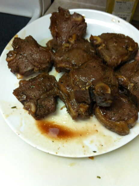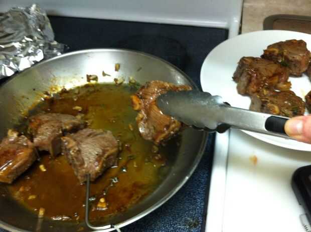 Sacar la hoja y póngala a un lado. Tenazas, retire las chuletas y colocarlas en un plato. Limpie cualquier bit de Romero de la carne. Cúbralas ligeramente con una pequeña tienda de papel.