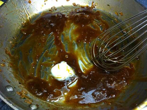 Cuando la salsa no tan caliente (pero todavía lo suficientemente caliente para derretir la mantequilla), añadir la cucharada de mantequilla. Bate la salsa mientras la mantequilla se derrita lentamente. Si la salsa no estaba demasiado caliente, la mantequilla no separe en la salsa.