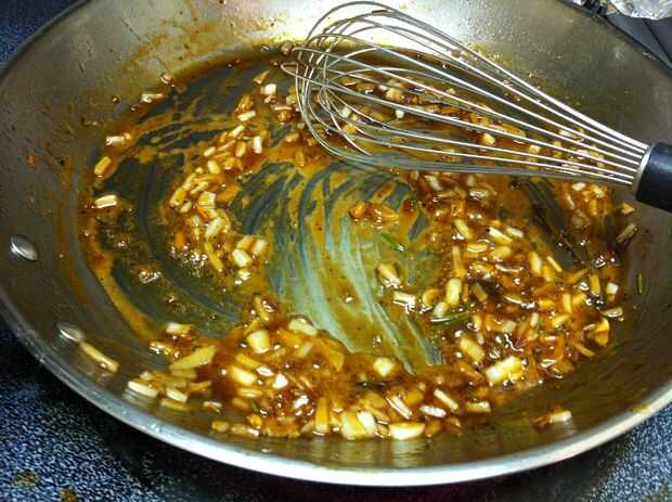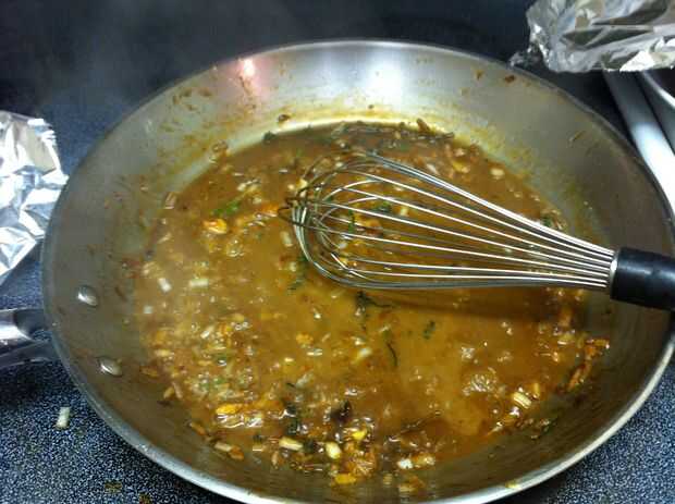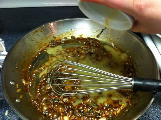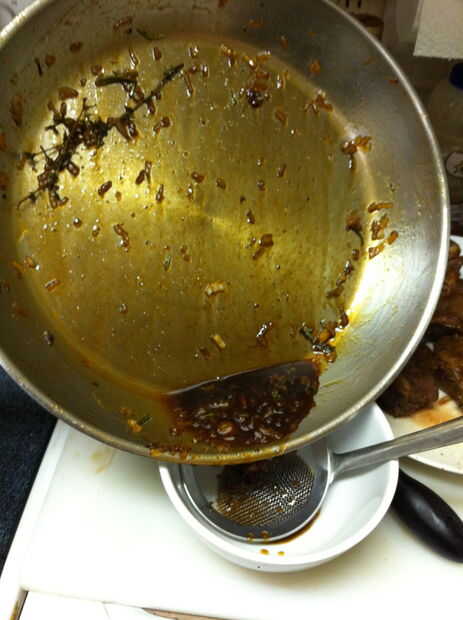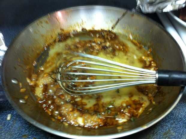El agua de la cebolla debe ayudar a aflojar para arriba algunos de los pedacitos dorados y pegajosa salsa en la sartén. Mientras se cocinan lejos, sin embargo, todo será más difícil revolver. Agregar la media taza de agua o caldo de pollo de bajo contenido de sodio antes de se ponga demasiado oscuro. Bata hasta que todo se mezcla bien. Filtra esta mezcla en un recipiente antes de volver a la bandeja, pero sólo podría utilizar un tenedor o unas pinzas para seleccionar los bits leñosos de los tallos de la hierba (y agujas de Romero) si lo prefiere. Tuve que usar algo que no sea mi colador normal porque alguien utiliza ambos filtros de mi para refinar la resina de abeto y todavía no ha limpiado todos los residuos de pino con alcohol desnaturalizado como prometió. * ejem *