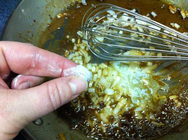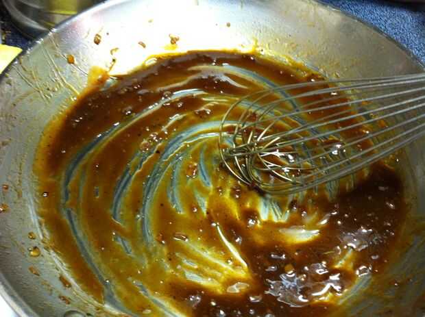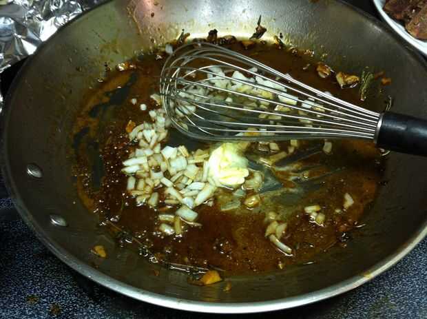 Coloque el recipiente sobre la estufa a fuego medio. Añadir unas cucharadas de la cebolla picada que sobra. DIJE que no lo desperdicies. Puede Agregar un poco de mantequilla para que la cebolla no se pegue a la bandeja de jarabe si quieres. Revuelva con frecuencia como la cebolla ablanda. Si quieres acelerarlo, añadir una pizca muy pequeña de bicarbonato de sodio a la cebolla. Incluso mejor que la sal funciona cuando estás ablandando cebolla (algo que ver con contrarrestar pectina... puede buscarlo. Ya estoy cansado). Puede agregar otra cucharada de miel y vinagre balsámico si usted está preocupado de no haber suficiente salsa... pero no más que eso. Usted no necesita, y no desea diluir demasiado los otros sabores.