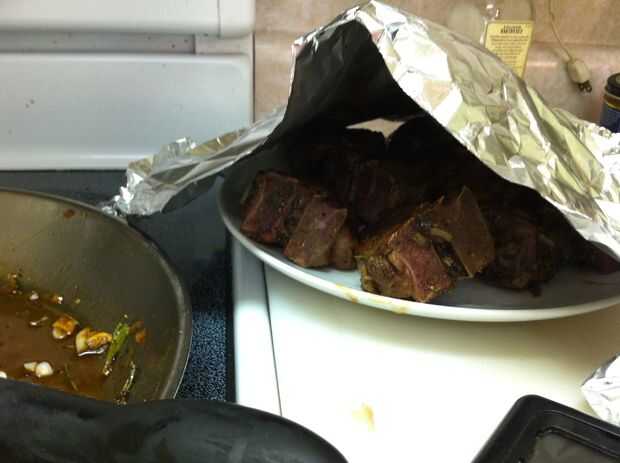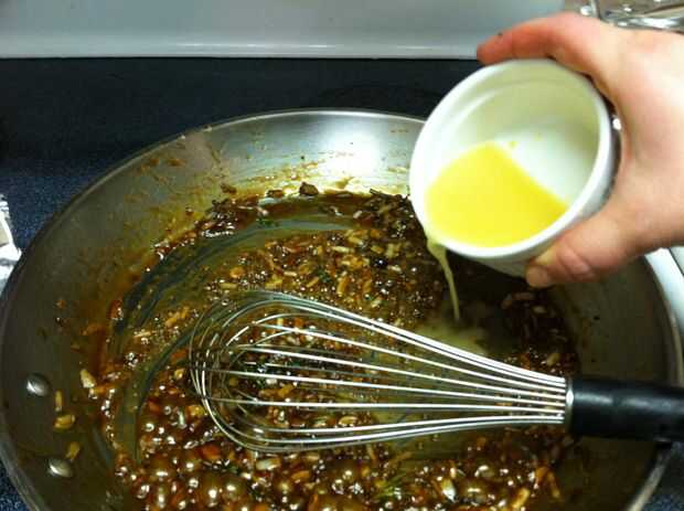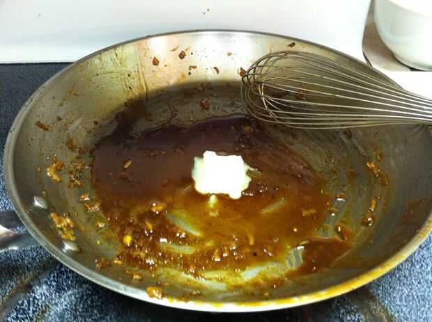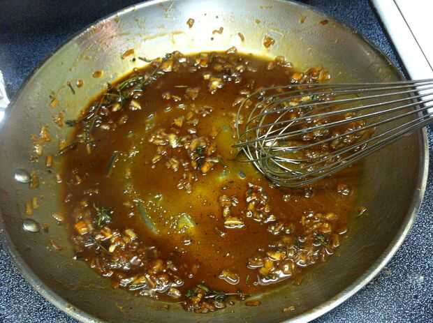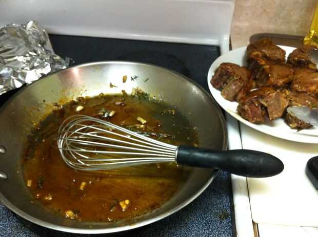No hay mucho líquido para reducir, por lo que incluso con el deglazing (agitando el cocido en la esencia de la carne con el líquido añadimos a la sartén), esto no debería tomar más de un par de minutos.