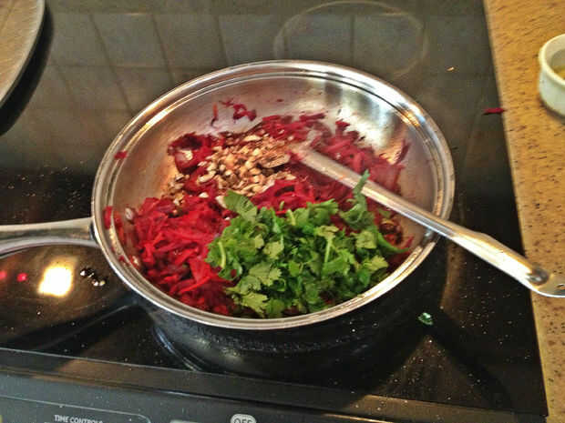 Justo antes de que la mezcla llega a ser suave, añadir que algunos cilantro hojas así como algunos cacahuetes tostados picados.