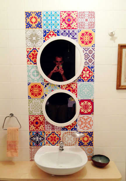 Que usé pegatinas que parecen baldosas hidráulicas para dar color en el lavabo.