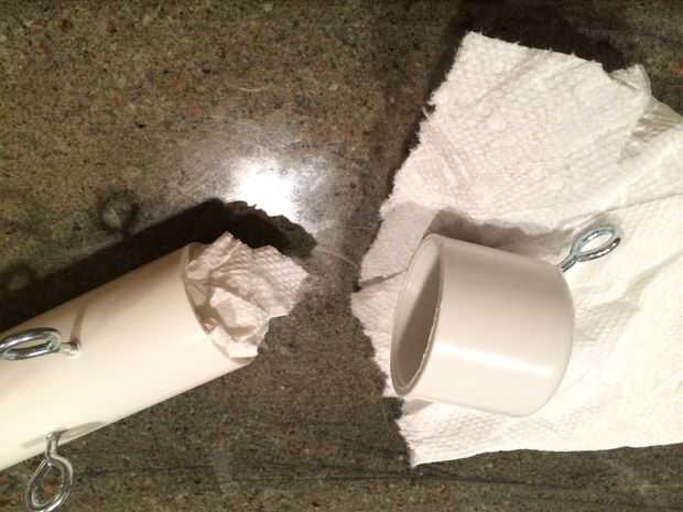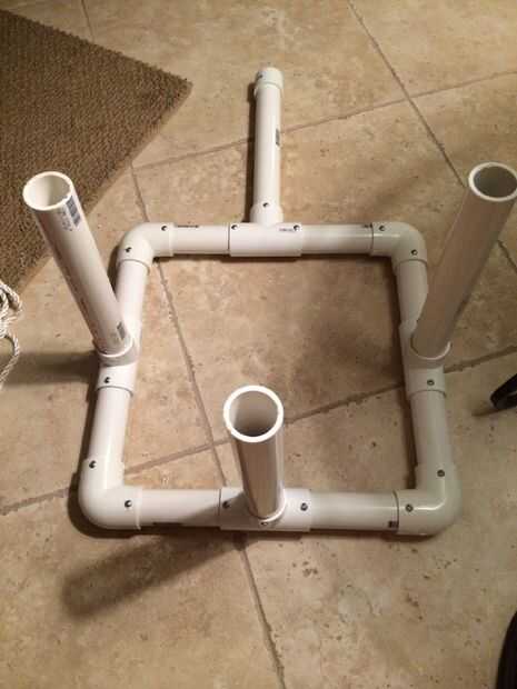 Necesita colocar codos de 90 grados en cada esquina. Una camiseta va también en el centro de cada sección. Tres de los tees servirá como la base de la jaula y la t frente permitirá una prórroga para correa la bolsa chum. No sujete la tapa en el tubo porque no sé si es tienes que extenderla hasta después del viaje inaugural. La toalla de papel es relleno en el extremo para evitar que el cemento se derrame hacia fuera.