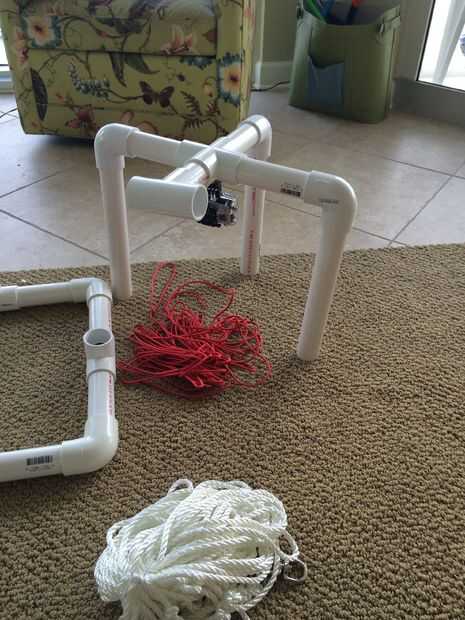 Utilizar 3 codos de 90 grados. Un conector de 4 vías y una camiseta. Cada sección es de 6 pulgadas, aproximadamente. La imagen muestra un ajuste seco de la parte superior de las piernas.