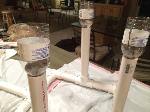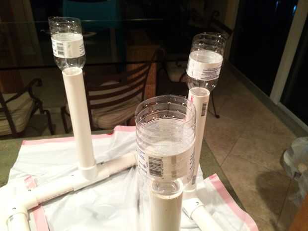 Ayuda a utilizar un embudo para que corte algunas botellas vacías de agua a la mitad y había pegado en las patas. Usted quiere tener esta listo porque el cemento se seca bastante rápido.
