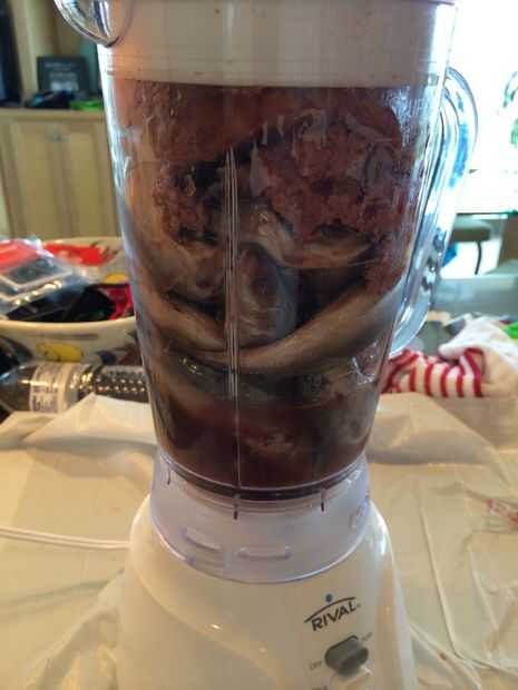 1.) lugar parcialmente descongelado cebo de peces en la licuadora, asegurándose de que los jugos se van con ellos. Yo minnows de cigarro, pero no importa como son peces, ellos están muertos y están parcialmente congelados.