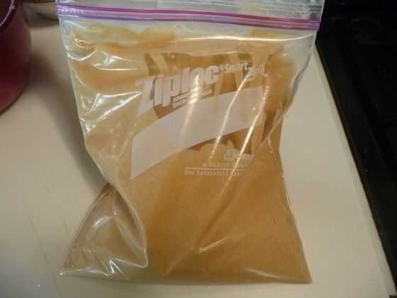 Una vez que todo el azúcar ha sido añadido a la mezcla de maní, vierta en una bolsa ziplock, exprimir la mayor parte del aire y el sello.