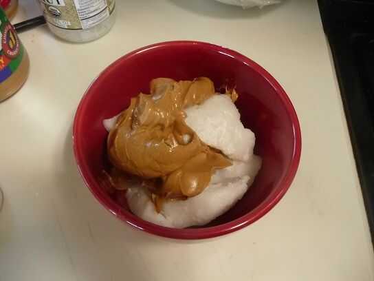 Mezclar la mantequilla de cacahuete cremosa 1 taza y 3/4 taza aceite de coco en un bol profundo separado.