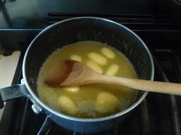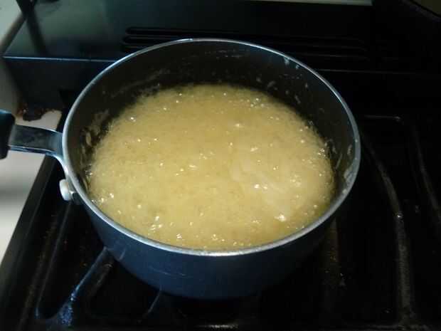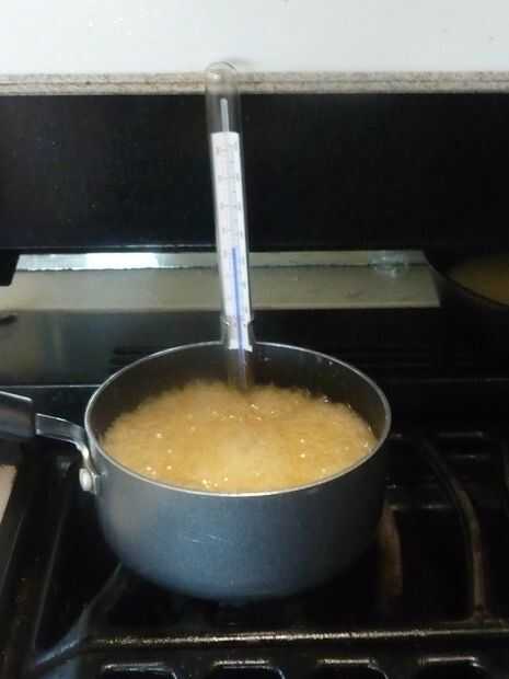 Cuando la mezcla empiece a hervir, retirar la cacerola del fuego brevemente bastante cuidadosamente el termómetro de caramelo a la bandeja de clip, luego volver al calor. 3. mantener una estrecha vigilancia en el termómetro de caramelo! * continuar revolviendo. Lo que está buscando una lectura de 300 ° f y un color dorado profundo. El color se oscurecerá rápidamente así como la marca de 300°. (No parpadean ;-)