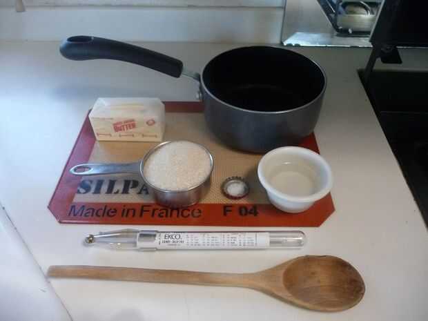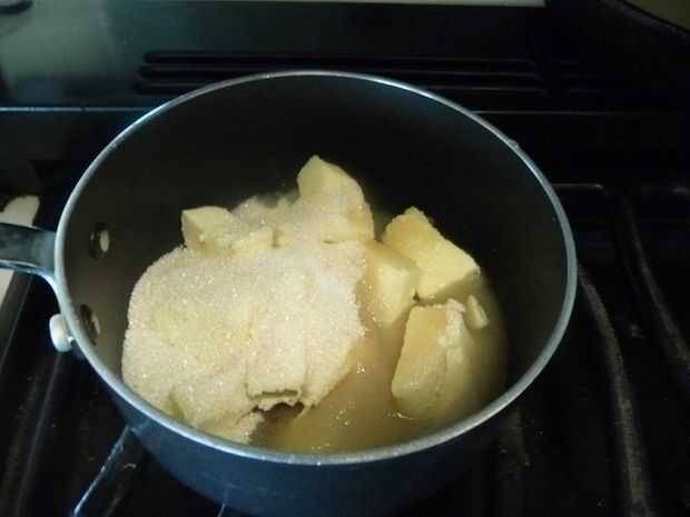 1. poner 1/2 taza de mantequilla, 1/2 taza granulado de azúcar, 2 cucharadas de agua y una pizca de sal marina en una olla mediana pesada.