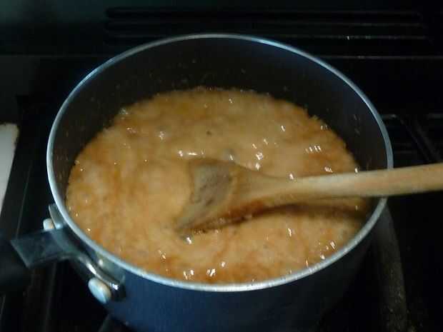 2. poner a hervir sobre fuego medio, revolviendo constantemente con una cuchara de madera.
