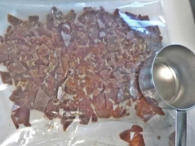 5. deje que el caramelo se enfríe completamente, colocar en una bolsita ziplock y golpee con el dorso de una cuchara pesada o taza de medición.