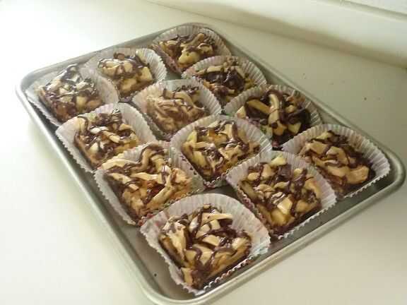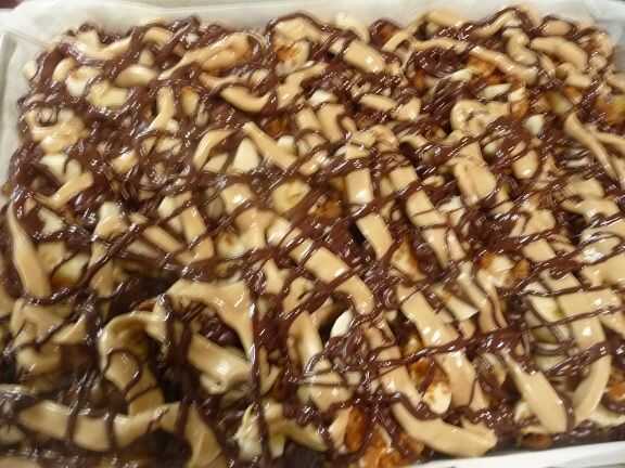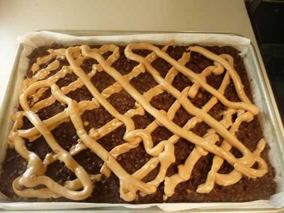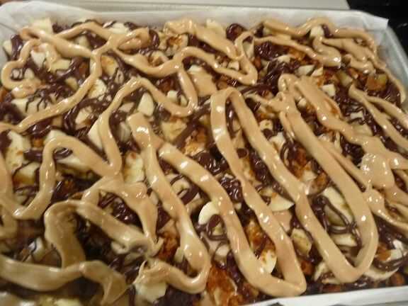 Refrigerar inmediatamente la bandeja llena. Cuando la llovizna chocolate ha (5 - 10 minutos), cubra con envoltura plástica. Coloque la bandeja de galletas en el frig. Relajarse durante unas horas (y hasta 3-4 días!) antes de servir.