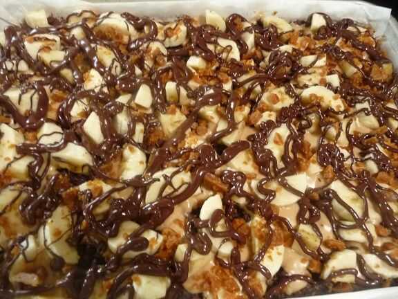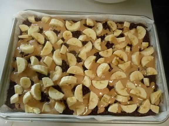 Pelar los plátanos maduros apenas, cortarlas horizontalmente, la verticalmente en trozos bien. Dispérselos igualmente sobre la mezcla de mantequilla de maní.