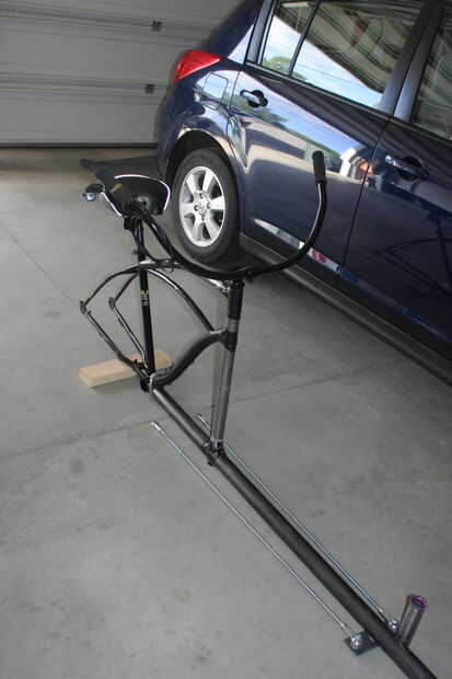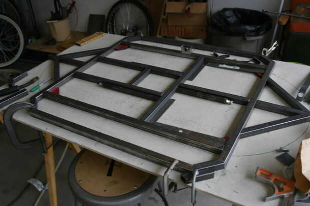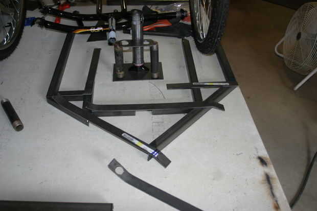Yo diría que esto fue la parte más difícil. Corte una bicicleta nueva marca en la mitad. Soldado con autógena la viga principal carro marco modificado. Poniendo hacia fuera y el carro de soldadura de tachuela toman un tiempo. De sujeción era importante para evitar la deformación del carro.