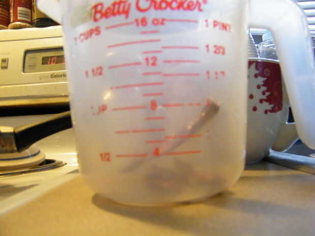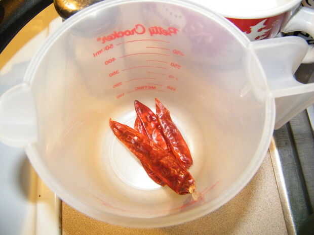 Añadir a la taza de medición y tratar de ser amable con los pimientos que son frágiles y necesitan ser suave lentamente.