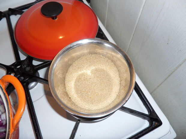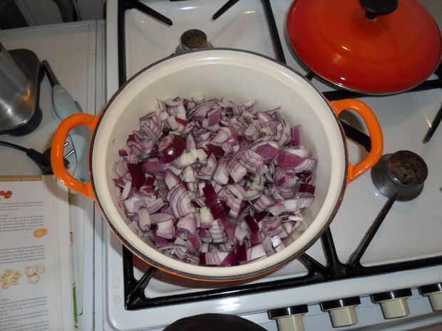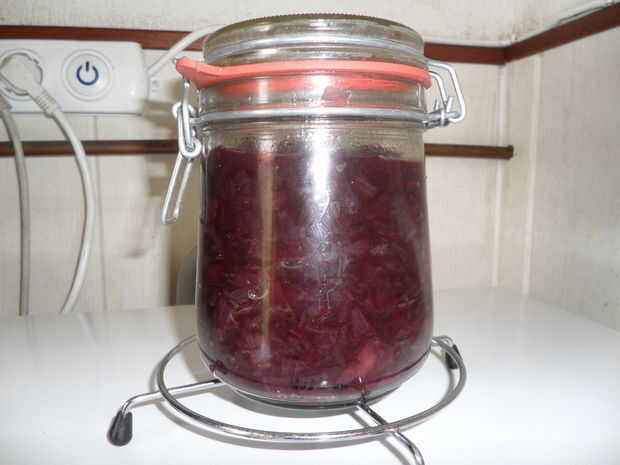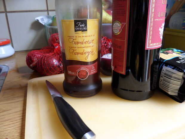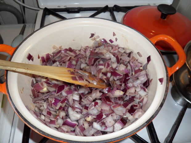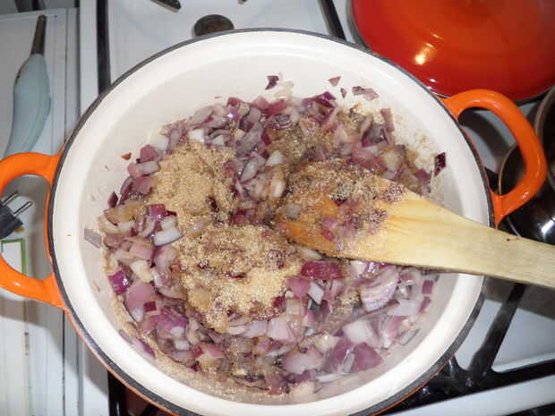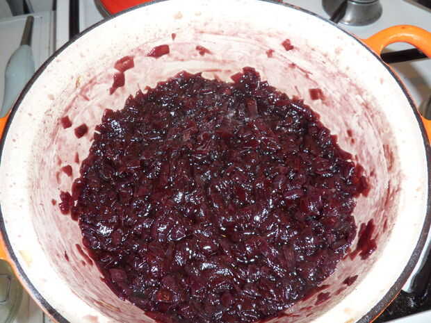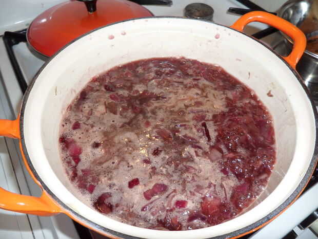Añadir el vinagre, el vino, la sal y la pimienta y hervir sin tapa hasta que se reduce a una masa espesa (se tarda unos 15 a 20 minutos).