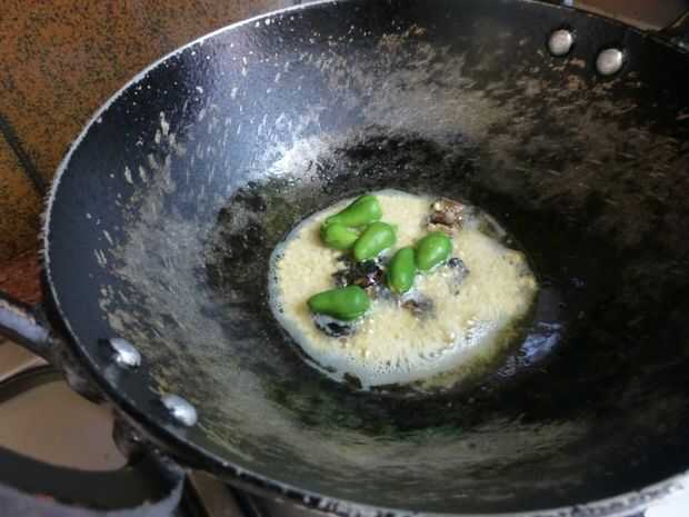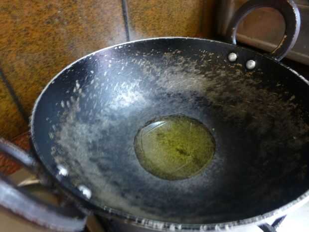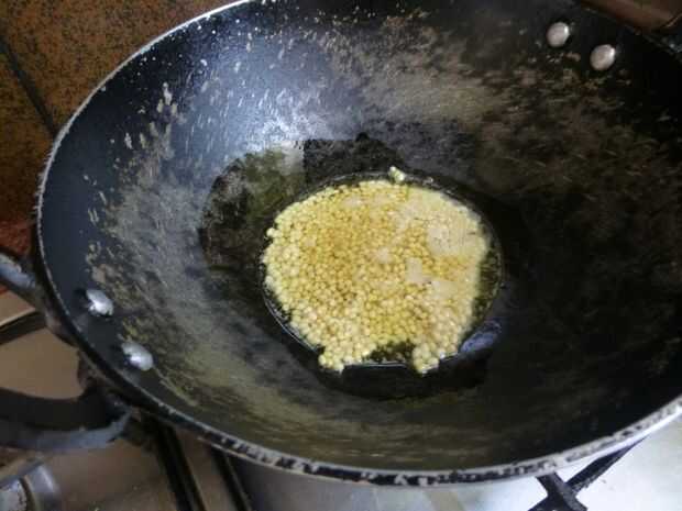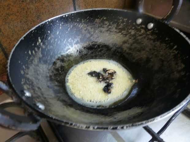 • Cuando el aceite se calienta agregar lentejas gramo negro, Tamarindo, chiles verdes y pedazos de coco.