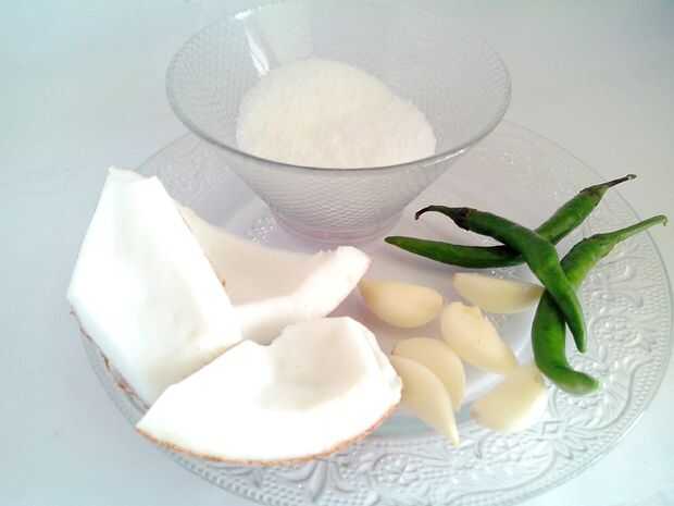 Salsa picante del coco es una inmersión indio del sur se sirve con variedades Dosa, Idli y Vadai. Sur India desayuno artículos como el Idli y la Dosa son incompletos sin la salsa picante del coco. Es una pasta gruesa semilíquida hecha con el coco com