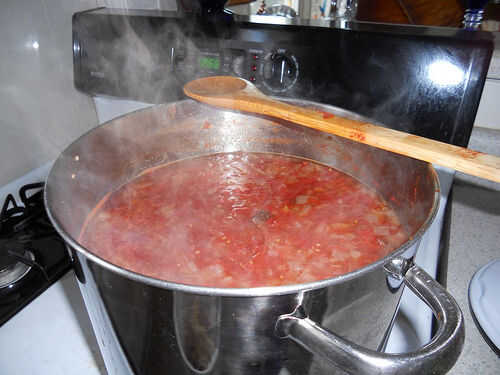 • continuar hirviendo a fuego moderado durante unos 10-15 minutos revolviendo frecuentemente para que nada se pega al fondo de la olla.  La mezcla se oscurece un poco y comience a espesar