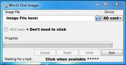 Que tienes una tarjeta SD y una manera de conectar a su PC. Enchufe en la tarjeta SD y conseguir a Windows32 Disk Imager (https://sourceforge.net/projects/win32diskimager/). Seleccione la unidad F: y el archivo .img para 8 Debian, Debian 7 o las otras imágenes de la NAND.