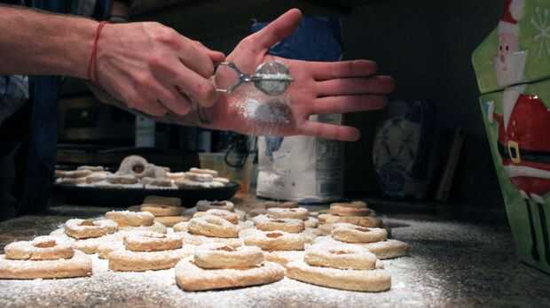 El último paso antes de que se puede comer su Ciambelle Sarde es que tienes en polvo con azúcar glas. Me gusta usar una bola de té para esto porque es fácil de sacar con pala encima del azúcar en polvo y luego golpeando contra mi mano distribuye uniformemente el azúcar sobre las galletas.