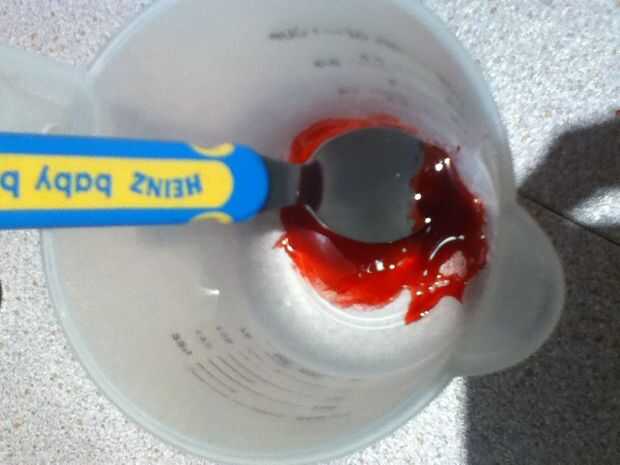 Colocar 7 gotas de colorante de comida rojo y 4 gotas si azul alimento colorante con 1tbs de oro jarabe y 1tbs de cualquier tipo de harina!