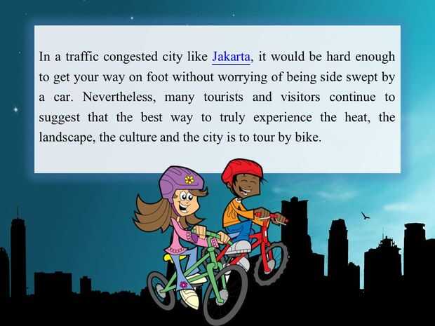 En una ciudad congestionada de tráfico como Jakarta, sería bastante difícil de conseguir su manera a pie sin tener que preocuparse de ser barrida por un coche de lado. Sin embargo, muchos turistas y visitantes siguen sugieren que la mejor manera de experimentar realmente el calor, el paisaje, la cultura y la ciudad es recorrido en bicicleta.