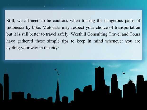 Todavía, todos tenemos que tener cuidado al recorrer los caminos peligrosos de Indonesia en bicicleta. Los automovilistas pueden respetar su opción de transporte pero es mejor viajar con seguridad. Westhill Consulting viajes y turismo se ha reunido estos sencillos consejos a tener en cuenta siempre que son ciclismo su camino en la ciudad: