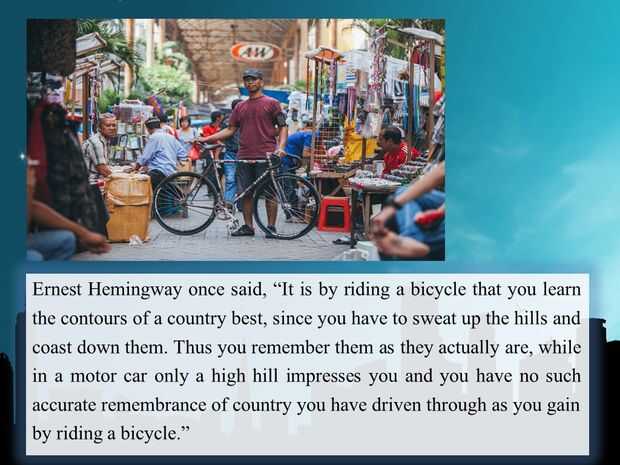 Ernest Hemingway dijo una vez, es por una bicicleta que aprendes los contornos de un país mejor, ya que tienes que sudar hasta las colinas y Costa abajo de ellos. Así recuerdan como realmente son, mientras que en un automóvil sólo una colina alta le impresiona y no tienes tal recuerdo precisa del país que han conducido a través de como ganar por andar en bicicleta."