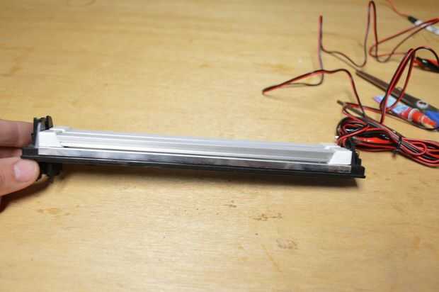 3. en cuanto a los cables, funcioné a través de pequeños canales en la parte inferior de donde se une el LED. También deberás enganchar los extremos juntos - tan positivo con positivo y negativo con negativo.