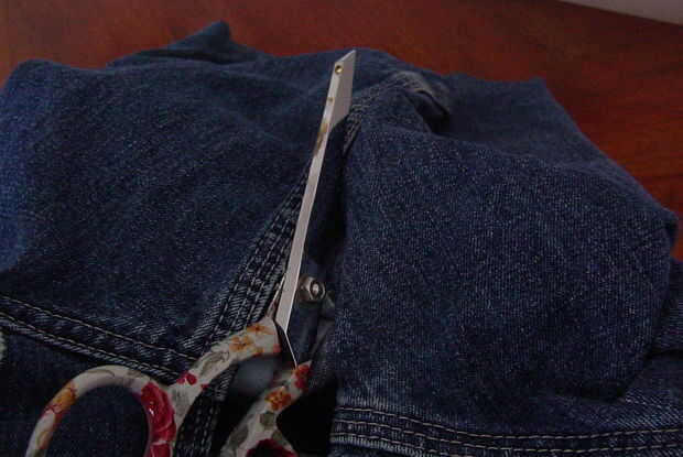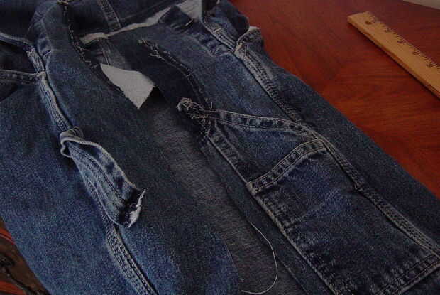 A continuación quería quitar la parte inferior de la espalda. Quería preservar los bolsillos poco frío en el lado derecho y lo descabellado de martillo en el lado izquierdo, así que corte por la parte posterior dejando 1/2 pulgada más allá de los bolsillos lindos (y el lazo del martillo) para un margen de costura. Saldrás de las costuras de la parte exterior intacta.