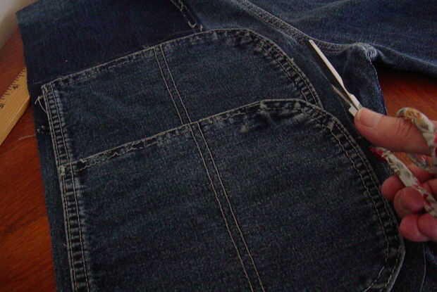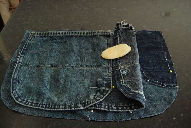 Para hacer la parte posterior de la cavidad, coloque los bolsillos en un pedazo sobrante de denim. Los bolsillos en lugar del PIN. Utilizando el lápiz de marca, o la astilla de jabón, dibuje una línea alrededor el bolsillo Agregar 1/2 pulgada como un margen de costura. Cortar el bolsillo del forro hacia fuera en la línea que marcó.