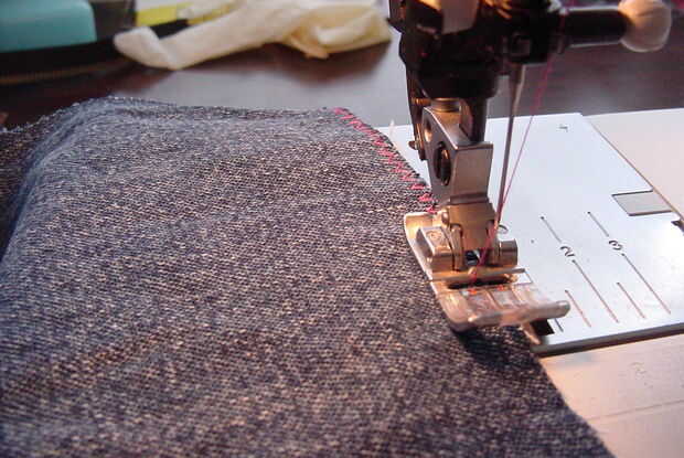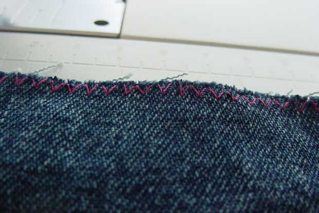 Usted puede simplemente zig-zag al borde de todos los bordes cortados. Utilice un hilo que empareja (mi imagen es hecho en color rosa muestra mejor) para el alto y la canilla.