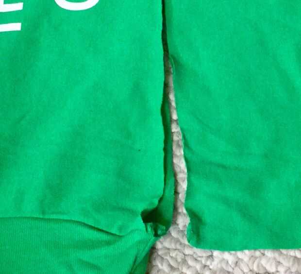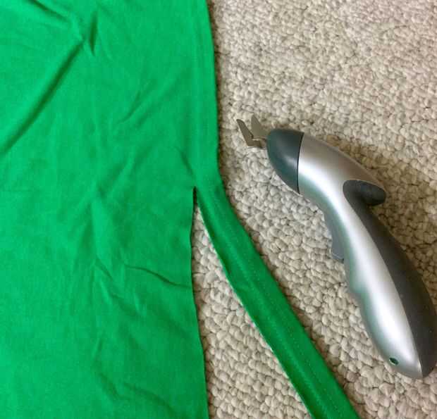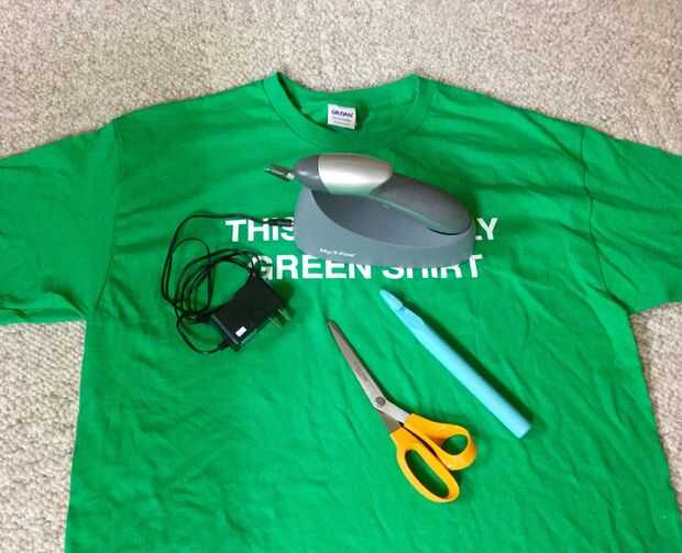 Extiende la camiseta sobre la superficie de corte. Yo uso una tijera eléctrica para hacer mi corte. Esta ha sido una gran herramienta para este proceso. He probado un cortador rotatorio, pero las capas son difíciles de trabajar a través.