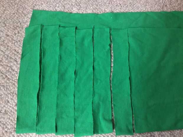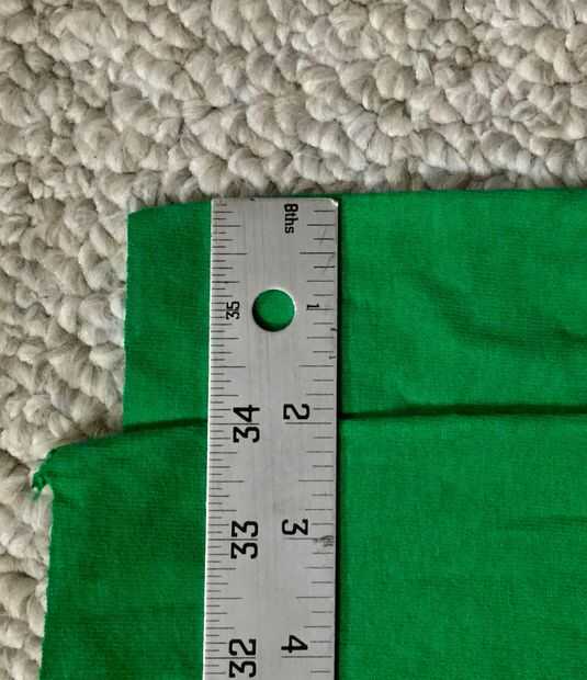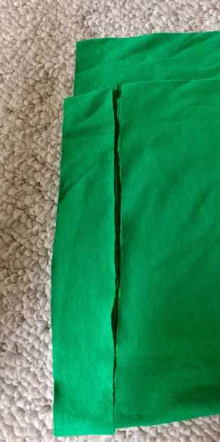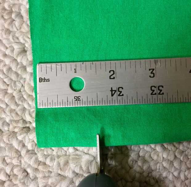 Doble la tela como se muestra arriba la capa inferior de la capa trasera cerca de dos pulgadas. Corte de la parte inferior atraviesa todas las cuatro capas líneas rectas cerca de 1.5" de apart. Una regla de metal puede utilizarse para obtener incluso separación. Parar el corte más allá de la tapa inferior.