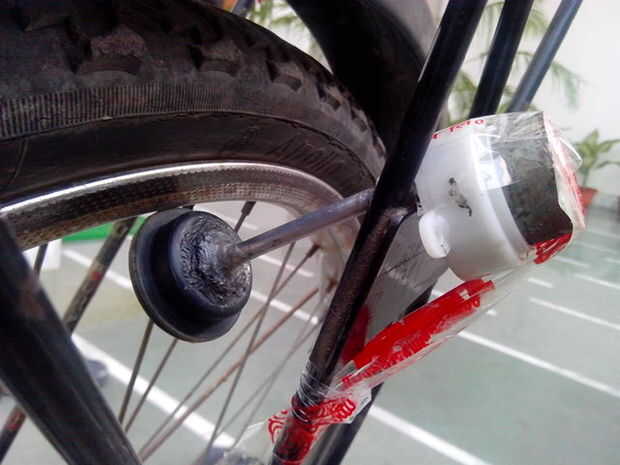 la rueda de caucho toca el borde de la bicicleta por lo que se puede girar.