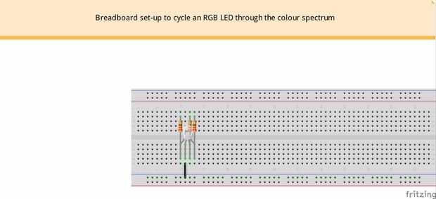 Suavemente le parte las piernas un poco para que puedan conectar en el protoboard, asegurándose de que cada pierna está en la misma línea que un resistor correspondiente.