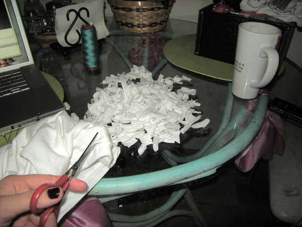 Ahora toma el resto de la tela que comenzó con y simplemente cortarlo en trocitos. Esto será utilizado para el interior de la almohada, lo que es grande acerca de este paso es que no hay ningún desperdicio en el proceso.