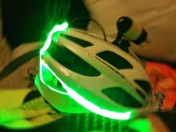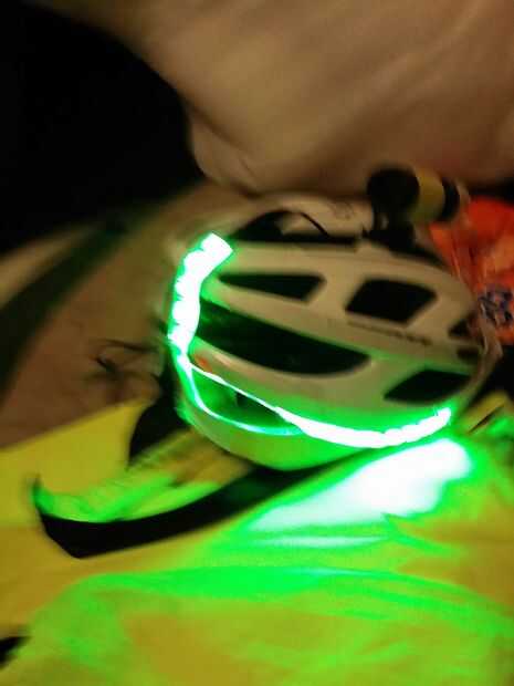 He utilizado 4x3v CR2033 "botón" pilas. Estos están montados en un pequeño tubo de cartón y agua impermeabilizado con un corte encima del tubo interno de la rueda. luego se amarró a la parte superior exterior del casco con bridas. Yo no he instalado un interruptor así que estoy moviendo a juntos el cable para encender en y llevándolo aparte para apagarlo.