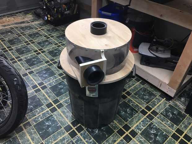 Se trata de un separador de polvo fácil de construir con un deflector. Funciona porque el aire es forzado alrededor de la pared exterior, donde el polvo pesado y caída de virutas a la basura grande pueden a continuación. Cuando se conduce con un soplador como usar, el deflector elimina la necesidad de un sistema de colección de polvo autónomo (que no todo el mundo tiene el dinero, espacio o energía para acomodar). Cuando se utiliza con una aspiradora de taller, este colector de polvo simple grandemente prolongar la vida de sus filtros y evitar la necesidad constante de vaciar el recipiente vacío, que suele ser pequeñas y difíciles de eliminar.