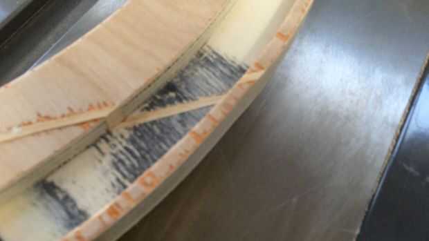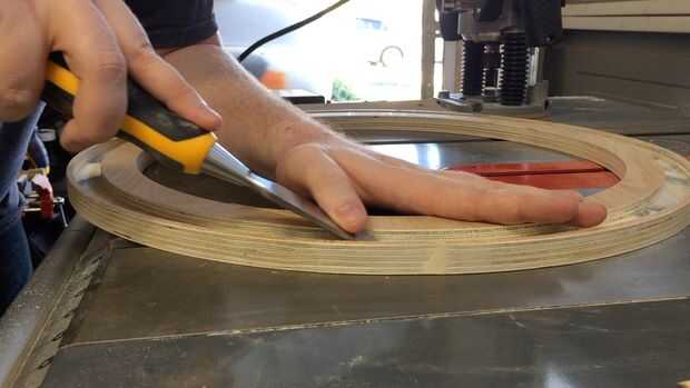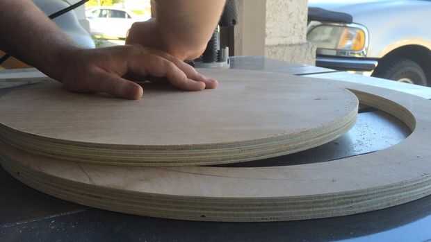 - De 20" círculo, cortar un círculo de diámetro de 16" del centro. Quedará con un anillo ancho de 2" de madera con una ranura en una cara. Si está usando una sierra de cinta para sacar la media, la ranura en el ring se llenan de chatarra y recortar para ajustarse.