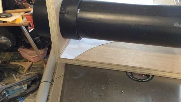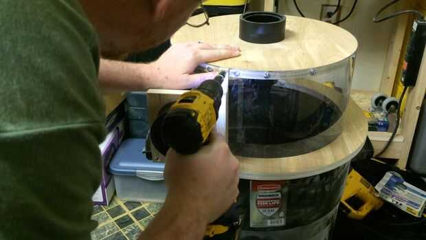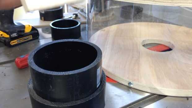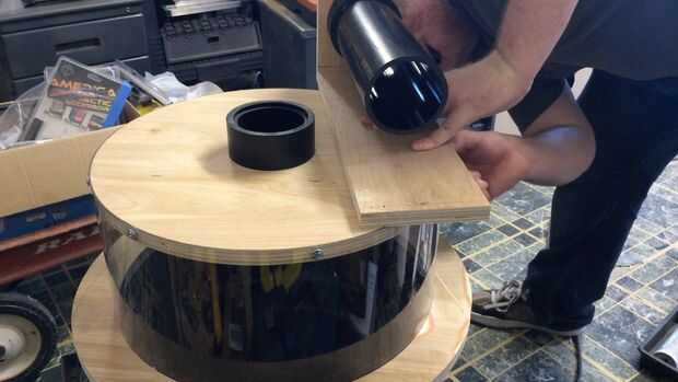 - Coloque el conjunto de entrada de tubo y madera contrachapada y colóquelo sobre el montaje de deflectores. El tubo debe orientarse que el aire entrante se envía alrededor de las paredes de la caja acústica, por lo que montar la tubería que sea tangencial a la Asamblea de deflector circular. Trace una línea en el conjunto de entrada donde se superpone el montaje de deflectores.