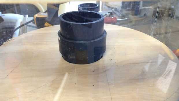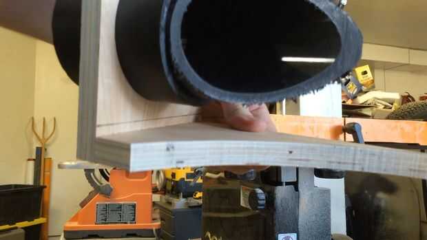 - Monte el 9" de longitud de tubería DWV en el agujero intercalando las dos mitades del acoplador DWV alrededor de la madera contrachapada. Asegúrese de que es un ajuste apretado. Si no, puede que desee agregar algunos pegamento caliente para mantener en su lugar.