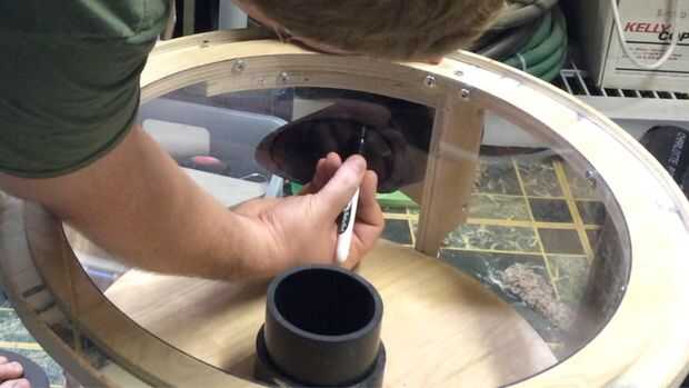 - En el interior del policarbonato, marque la ubicación de la entrada con un marcador permanente. Usted puede ya sea cortar esto con una herramienta giratoria como se muestra en el video, o puede desmontar la placa deflectora y usar la sierra caladora para seguir la línea.