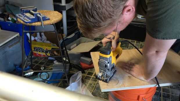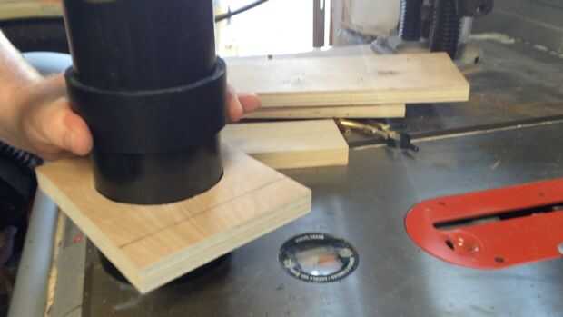 - Cortar un 3 ½" agujero en una 5" x 6" pieza de madera contrachapada. Si utiliza tuberías diferentes, ajustar por consiguiente. Nota: esto será más fácil si usted comienza con una pieza de gran tamaño, recortar al tamaño final.