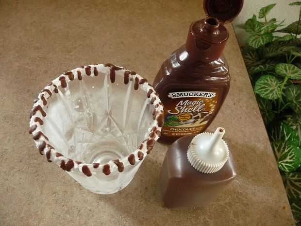 Una vez helada-frozen, tomar el vaso del congelador y goteo/llovizna algunos magia cáscara de Chocolate alrededor del borde. Puesto que su vaso está congelado, la magia Shell Chocolate no viajar mucho y hacer un lío.