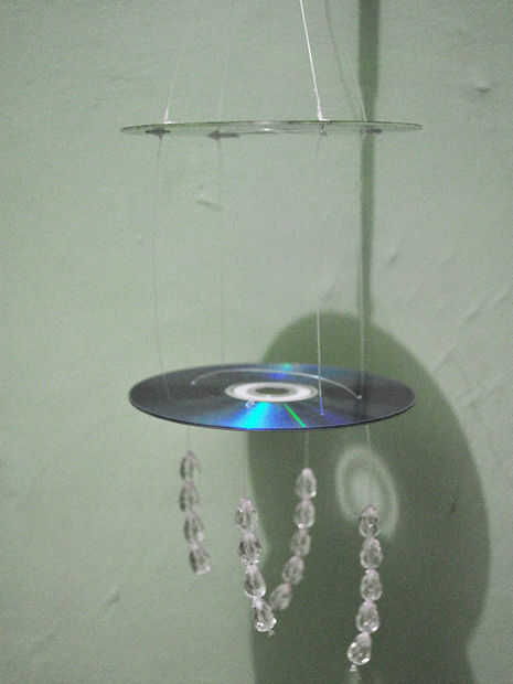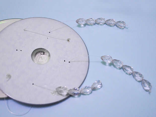 Perfore el CD para agujeros adicionales. Coloque la serie de knick knacks uno por uno. No te olvides de atar. (ver imagen 6 y 7)